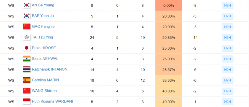 PV Sindhu’s biggest career nightmare is An Se-young, having lost all eight encounters against her. Additionally, Sindhu’s win rates are low against Tai Tzu-ying (5-19), Ratchanok Intanon (4-10), Carolina Marin (6-12), Gao Fangjie (1-4), and He Bingjiao (9-12), among others.