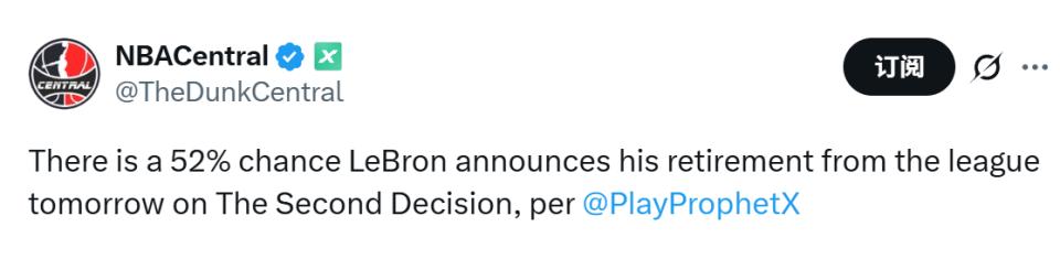 On October 7th Beijing time, LeBron James unexpectedly posted on social media: "The decision of all decisions, October 7th, 12 PM Eastern Time (midnight Beijing time on October 8th)." Following this, the top US sports prediction platform ProphetX assessed a 52% probability that James will declare his retirement tomorrow. Well-known US media CBS analyzed James’ teaser and questioned the Lakers superstar’s multiple retirement-related hype attempts, suggesting that when the real decision comes, few will believe it. Below is CBS’s analysis—