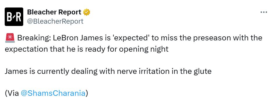 Shams stated: “I’ve learned that LeBron James has started increasing his training intensity and is doing some work on the court. However, the current expectation remains that he may miss the entire preseason. The team’s goal is to have him fully prepared for the October 21st season opener against the Golden State Warriors. So he has been doing more on-court drills and participating in more basketball-related activities, but whether he will play in any game before the regular season begins is still uncertain.”