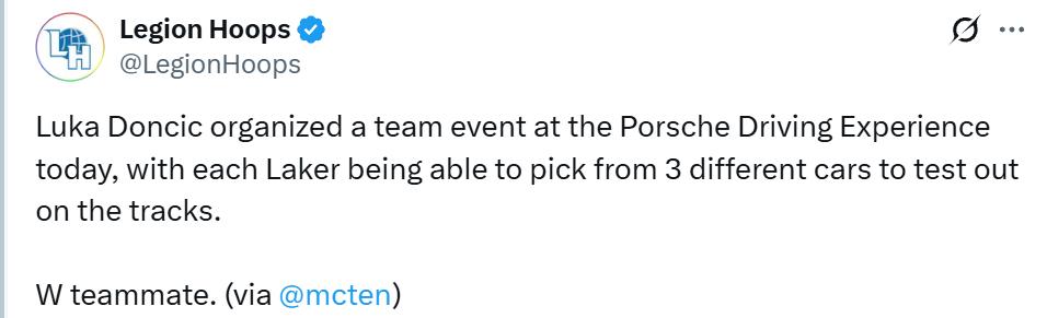 McMenamin stated: "After today’s practice, he (Doncic) personally paid to take all teammates to Southern California for a Porsche driving experience. They will drive models from the 911 and GT3 series on the track. Events like this allow everyone to temporarily escape the pressures of basketball, get to know each other in a new environment, and create shared memories while having fun — hopefully, these memories will help the team get through the inevitable tough stretches of the 82-game regular season."