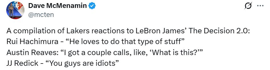 Earlier, LeBron's "Decision 2" drew significant attention, causing many fans to believe he was retiring, but it ended up being merely an advertisement with Hennessy. Lakers players were also asked about this after practice, and the following is a summary from reporters on site—