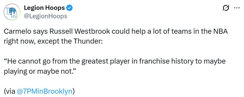 Regarding Westbrook’s potential destinations, Anthony believes he can still help many teams except the Thunder. “He’s the greatest player in this franchise’s history (Thunder), he shouldn’t be reduced to a situation where it’s ‘maybe he plays, maybe he doesn’t.’Unless he says, ‘Presti (Thunder GM), I want to retire as a Thunder, this is my final season, and we’ll have a retirement ceremony together,’ but if he goes back just to sit on the bench, that’s absolutely unacceptable..”