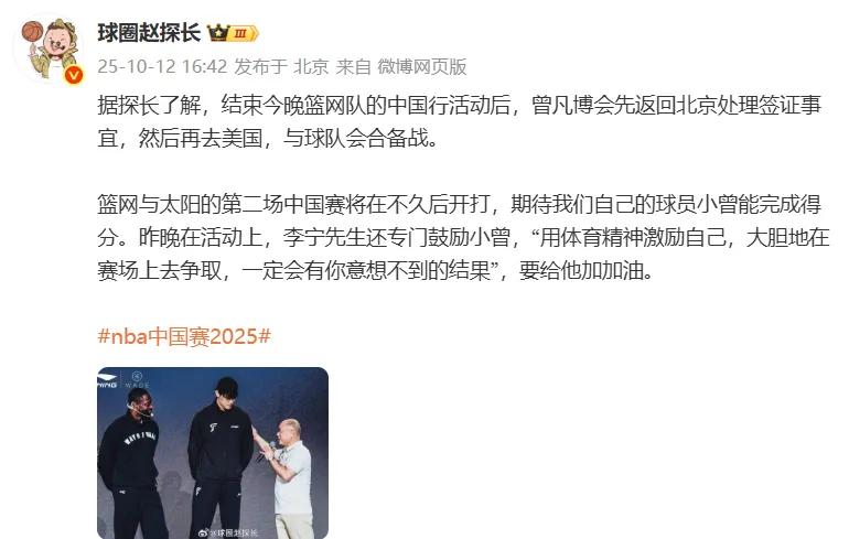 According to a well-known media source,after the China series ends, Zeng Fanbo will first return to Beijing to handle visa matters, then head to the US to join the Nets.The Nets still have one more preseason game to play on October 18 against the Raptors.
