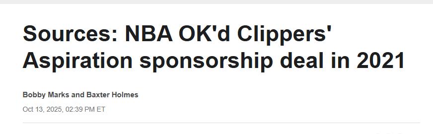 On October 14 Beijing time, ESPN reported, citing several sources,that in 2021 the NBA reviewed and approved a $300 million sponsorship contract between the Clippers and Aspiration.Several months afterward, this company signed an individual agreement with star Leonard, prompting the league’s probe into “salary cap evasion.”
