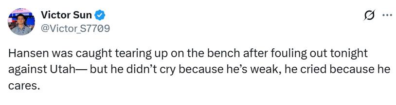 Reporter Victor Sun posted footage on social media showing Hansen crying, commenting: "After fouling out, Hansen sat on the bench in tears — but he cries not because he’s fragile, but because he truly cares."