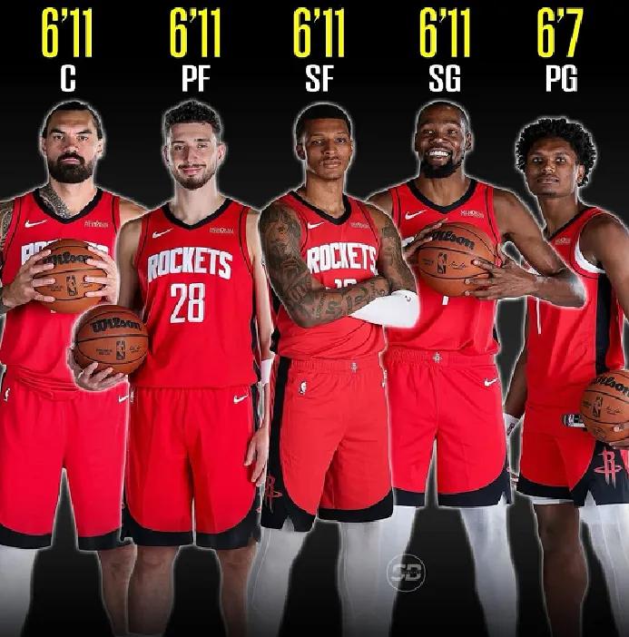 Rockets head coach Udoka announced the team's starting five for the opener,which includes Amen (2.01m), Durant (2.11m), Little Smith (2.11m), Sengun (2.11m), and Adams (2.11m), averaging 2.09m in height.