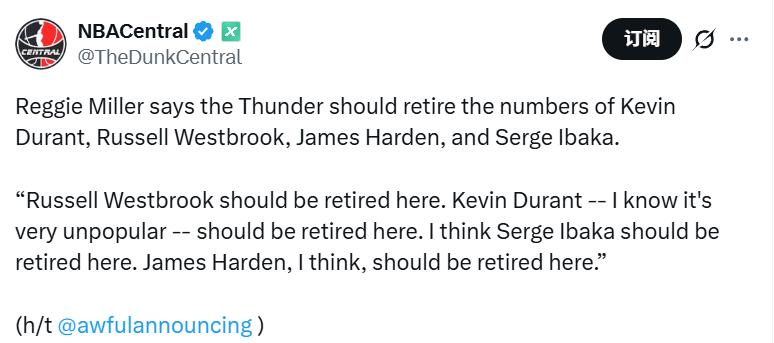 Afterwards, Miller started naming Thunder players he thinks deserve jersey retirement. "Russell Westbrook's jersey should be retired here. Kevin Durant, I know this is unpopular, but his jersey should also be retired here. I believe Serge Ibaka's jersey deserves retirement here as well. James Harden, I think his jersey should be retired here too."