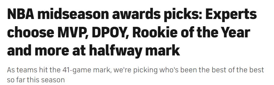 On January 14th Beijing time, NBA teams will finish their 41st game this week. CBS Sports’ six experts have named their choices for the six major midseason awards, with the detailed voting results as follows—