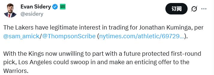 On January 15th Beijing time, as reported by The Athletic, league and team insiders confirmed that the Lakers show some interest in Kuminga, though it remains uncertain if official talks will begin. The Warriors have been informed of the Lakers' interest and are monitoring developments closely.