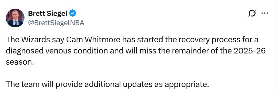 On January 16th Beijing time, the Wizards officially confirmed Whitmore’s diagnosis of venous vascular disease and that he has started recovery treatment. He will miss the rest of the 2025-26 season’s games. The team will release further updates when appropriate.