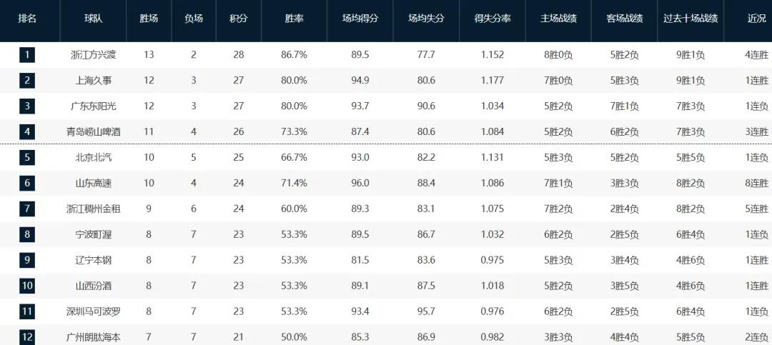 So far this season, the injury-hit Liaoning team has only managed an 8-7 record, ranking ninth in the league. The top four spots are held by the defending champions Guangsha at 13-2, Shanghai at 12-3, Guangdong at 12-3, and Qingdao at 11-4.
