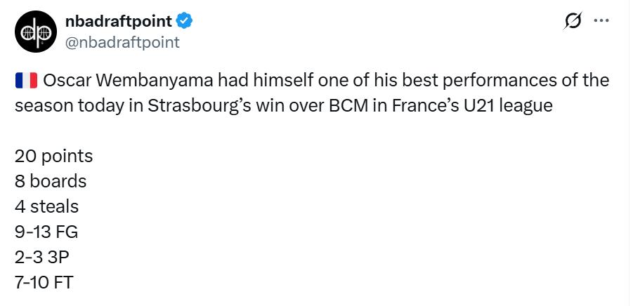In today's French U21 league game where Strasbourg defeated BCM, Victor Wembanyama's brother Oscar Wembanyama delivered an impressive performance, scoring 20 points, grabbing 8 rebounds, and making 4 steals. He shot 9 of 13 from the field, 2 of 3 from three-point range, and 7 of 10 from the free-throw line. At 18 years old and standing 2.03 meters tall, Oscar is eligible for this year’s NBA draft. He is a versatile forward.