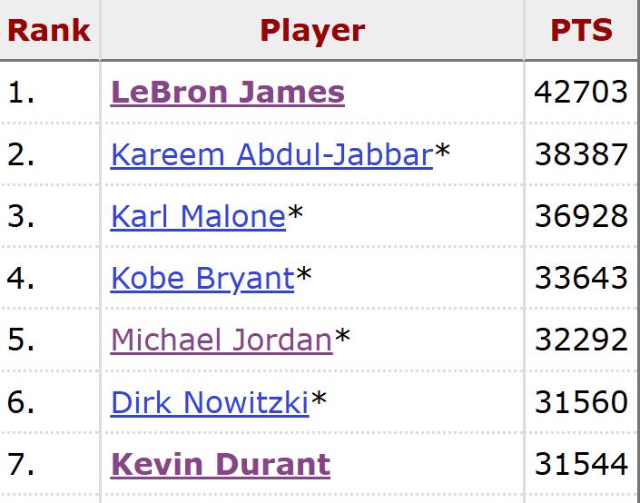 In his first season with the Rockets, Durant has already surpassed another legendary player in scoring. Earlier this month, during an away game loss to the Trail Blazers, he passed Wilt Chamberlain on the all-time scoring list, moving into seventh place. Durant still trails fifth-ranked Michael Jordan (32,292 points) by over 700 points, but given his current scoring pace, he has a strong chance to surpass Jordan this season.