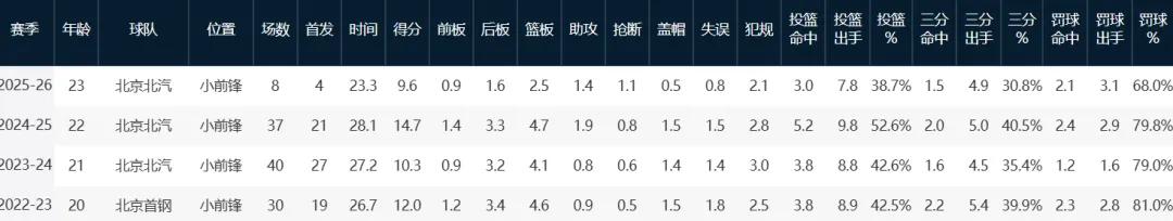 This season, after a long absence, Zeng Fanbo has only played 8 games, starting 4 times, averaging 23.1 minutes on the court, scoring 9.6 points, 2.5 rebounds, 1.4 assists, and 1.1 steals per game, with shooting percentages of 38.7%, 30.8%, and 68%. He is still working hard to regain his best form.