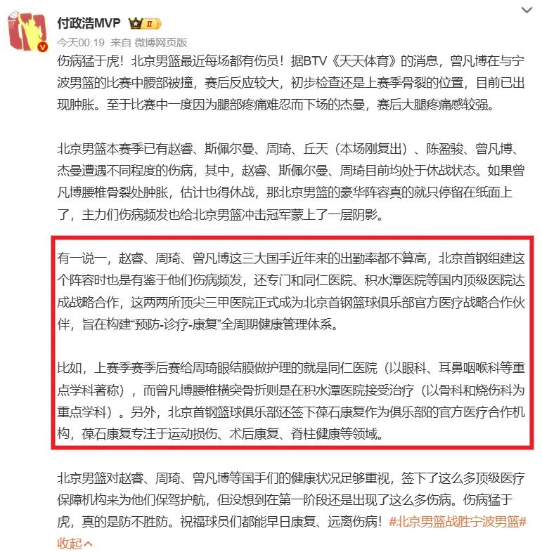 So far, the Beijing team has not released an official injury report on Zeng Fanbo. The lack of news might mean there is no serious issue, or they could still be awaiting further examination results.