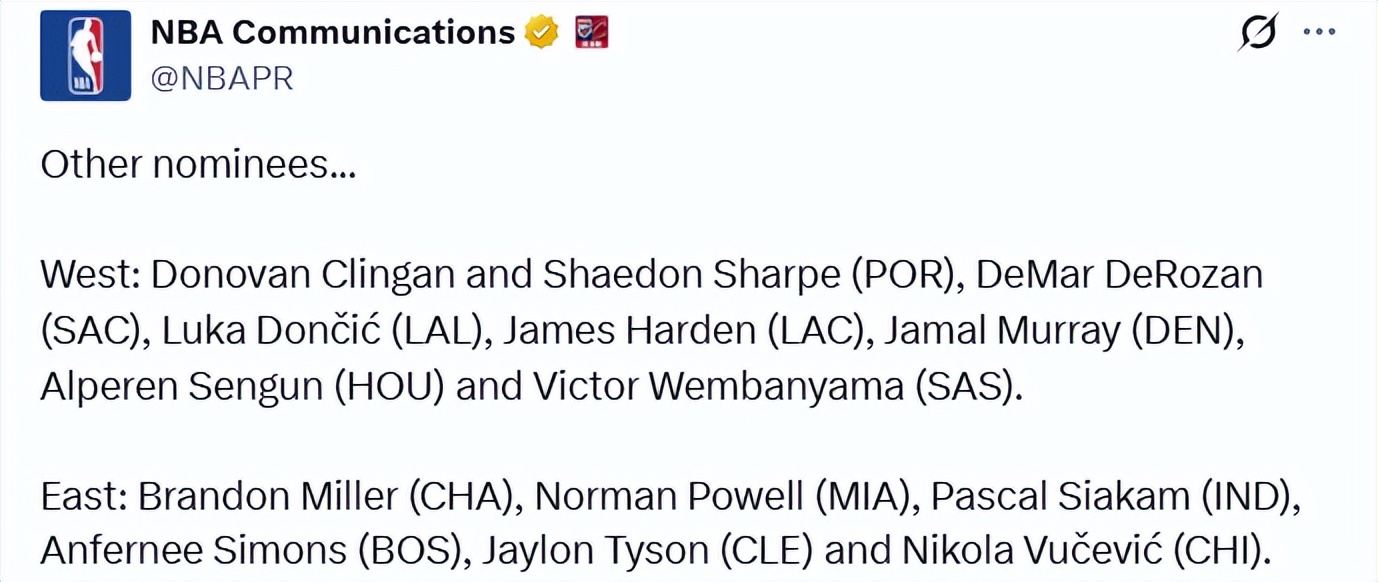 West: Klingenberg and Sharpe (Trail Blazers), DeRozan (Kings), Doncic (Lakers), Harden (Clippers), Murray (Nuggets), Sengun (Rockets), and Vembanyama (Spurs)