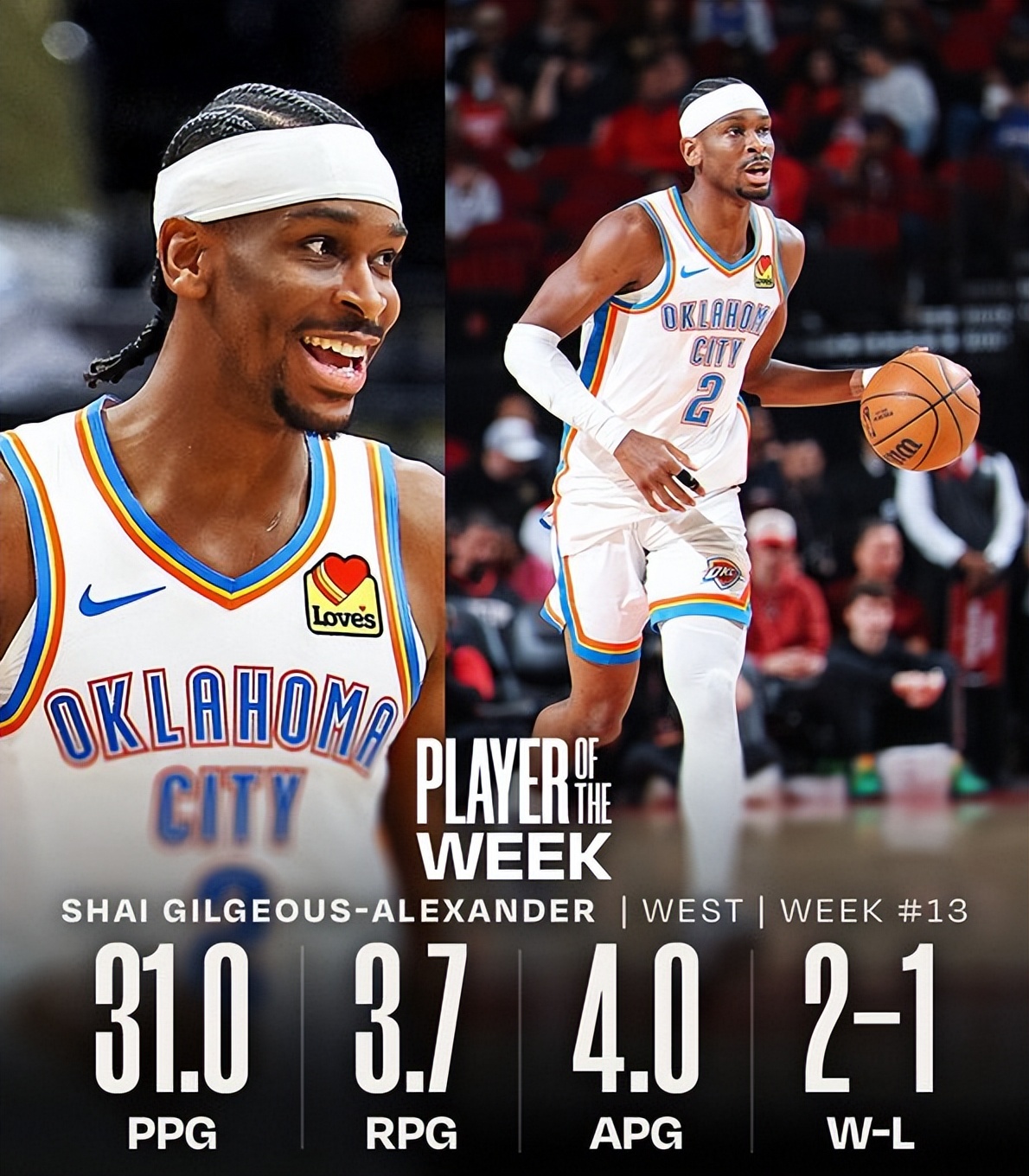 During the past week, Alexander led the Thunder to a 2-1 record, averaging 31 points, 3.7 rebounds, 4 assists, and 2 blocks per game, with a shooting percentage of 54.7%.