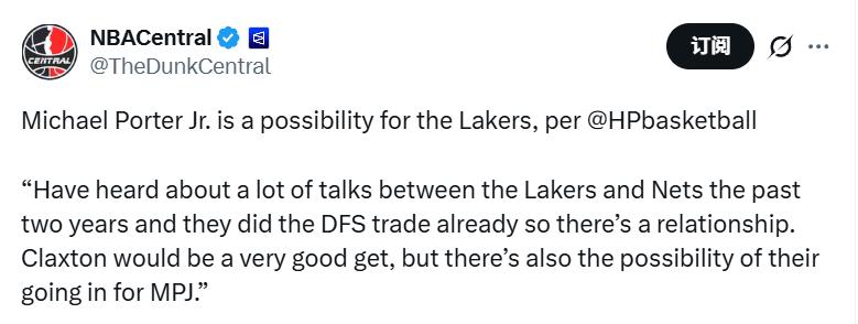 He wrote: "Over the past two years, the Lakers and Nets have engaged in several trade discussions and previously completed a deal involving Dorian Finney-Smith, maintaining a good cooperative relationship between the two teams.Claxton would be an excellent acquisition, but the team might also target Michael Porter Jr.."