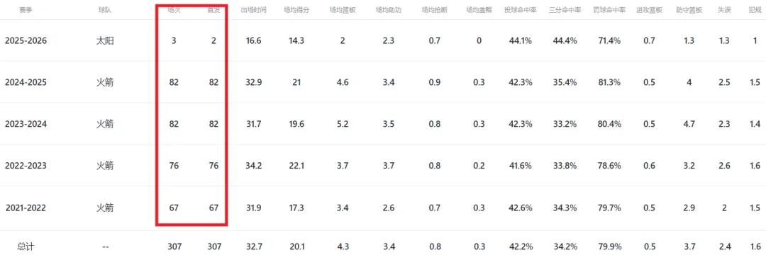 Speaking of Jalen Green, during his four seasons with the Rockets, he maintained excellent attendance, including two seasons with full participation. However, since joining the Suns, injuries have been persistent... This guy was born on February 9, 2002, was the 2021 second overall pick, and still has tremendous potential to unlock—provided he can stay healthy for the long term.