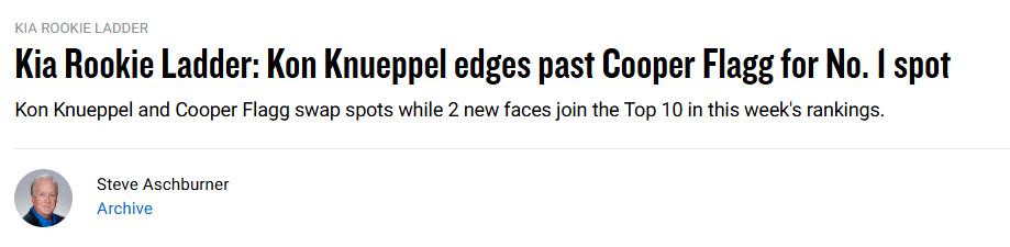 On January 21st Beijing time, the NBA official site published the newest rookie rankings. The Hornets’ 4th pick Knupel surpassed the number one pick Flagler to take the lead. Trail Blazers undrafted player Laver improved by one rank from last week, now at 8th. The detailed list is as follows—
