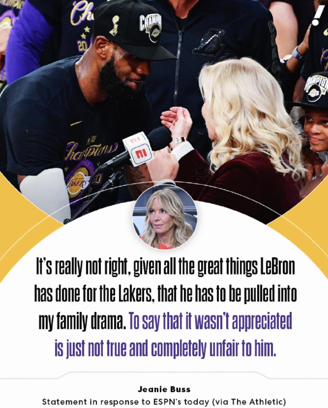 Reporter Sam Amick reported that Jeanie Buss quickly responded to ESPN’s article with a statement: “Considering all the outstanding contributions LeBron has made to the Lakers, it’s wrong to drag him into my family disputes. Claims that he is not valued are simply untrue and unfair to him.”