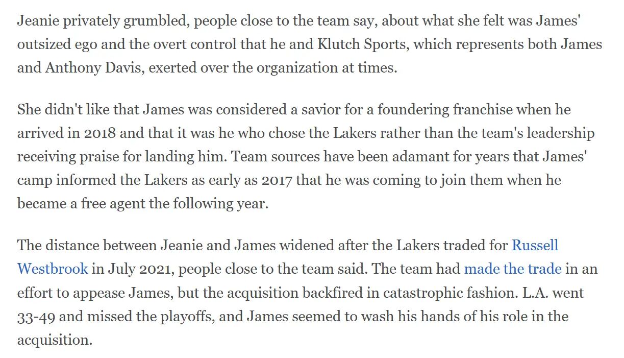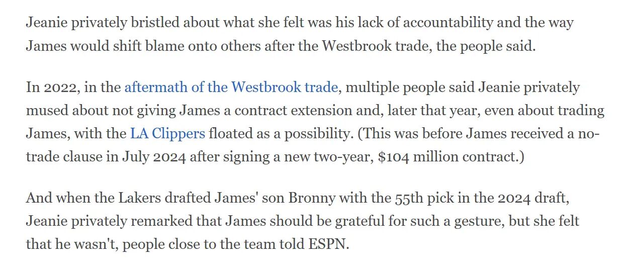 Therefore, in 2022, amid the fallout from the Westbrook trade,several sources revealed that Jeanie privately considered not offering LeBron a contract extension and even contemplated trading him, with the Los Angeles Clippers mentioned as a potential destination.