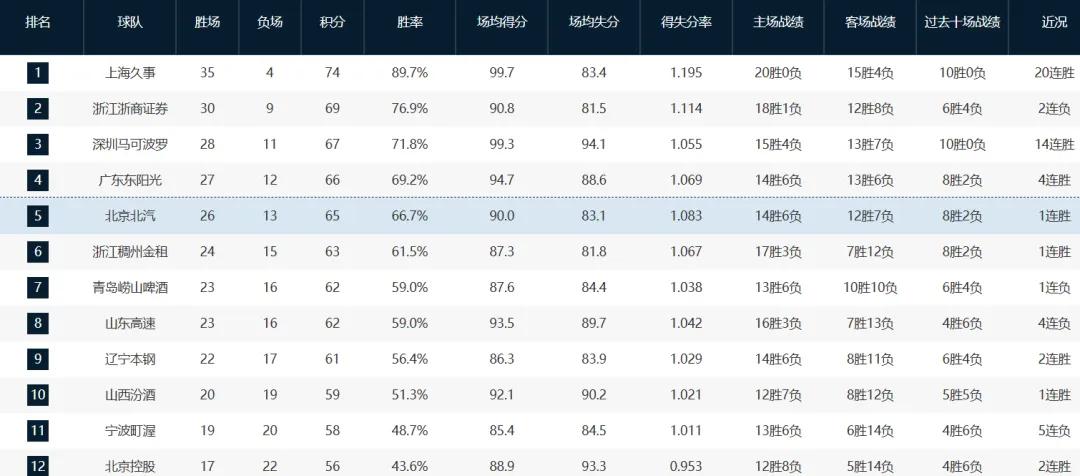 Beijing currently holds a record of 26 wins and 13 losses, ranking fifth in the league, behind Shanghai (35-4), defending champion Guangsha (30-9), Shenzhen (28-11), and Guangdong (27-12). This year's goal is undoubtedly to go all the way.