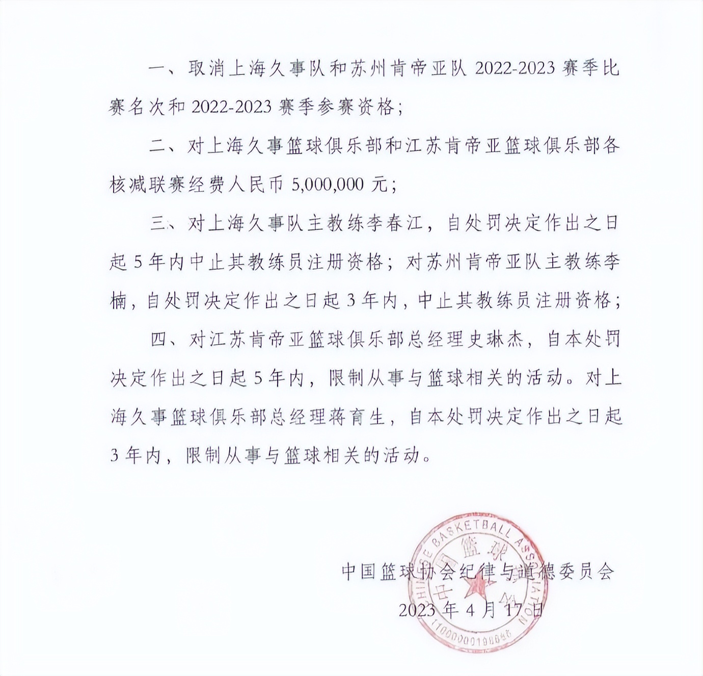 During the 2023 playoffs Shanghai vs Jiangsu series, the Chinese Basketball Association determined that both teams exhibited "passive competition" in Games 2 and 3, issuing unprecedented heavy penalties. Consequently, then Shanghai head coach Li Chunjiang was banned from coach registration for five years, and then Jiangsu head coach Li Nan was banned from coach registration for three years.