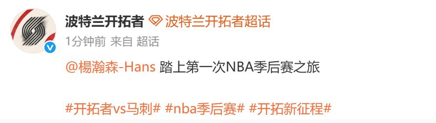 On April 19 Beijing time, the Trail Blazers official social media updated, sharing a moment of Yang Hansen boarding the plane with the team to fly to San Antonio. The official post stated: "Yang Hansen begins his first NBA playoff journey." In the image, Hansen is smiling as he boards the aircraft, starting his inaugural playoff trip in his NBA career. The Trail Blazers and Spurs' Game 1 will commence at, 9 AM on April 20.