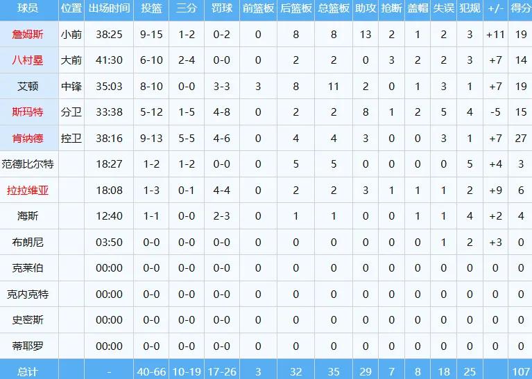 All five Lakers starters scored double-digits, James recorded a near triple-double with 19 points, 8 rebounds, 13 assists.