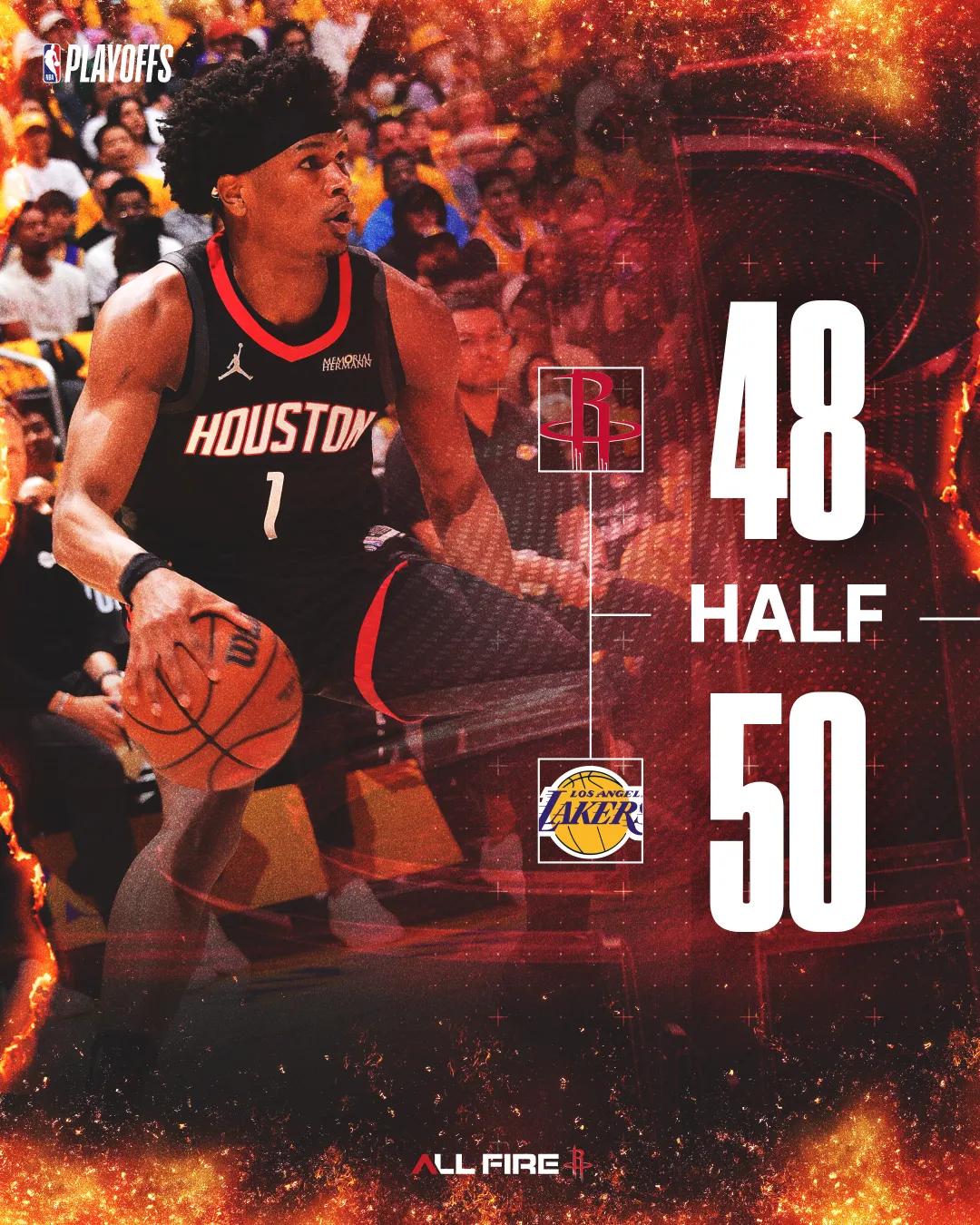The entire first half, Lakers 50-48 Rockets, seemingly only leading by two points, but the opponent couldn't catch up due to lacking a strong scoring point......