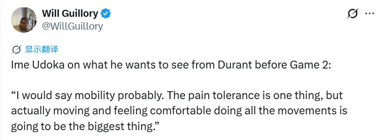 Udoka discussed the condition Durant needs to reach before Game 2: "I think the key is still mobility. Pain tolerance is one aspect, but being able to run smoothly, perform all movements, and feel comfortable physically is the most important thing."