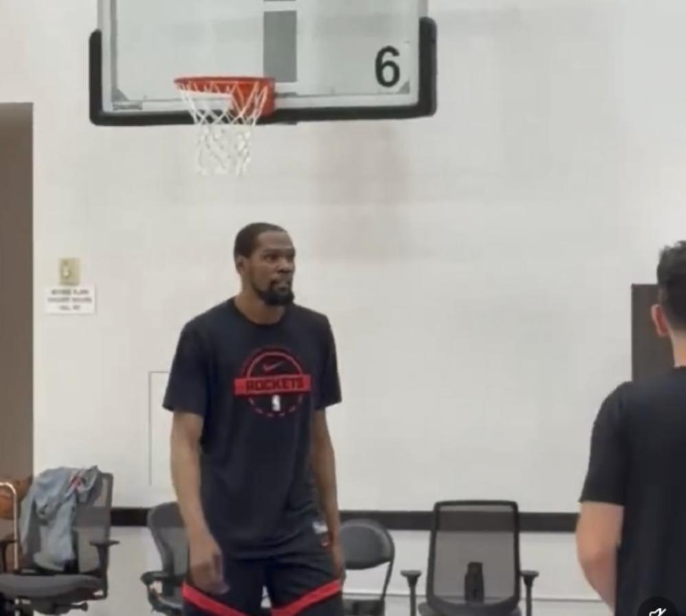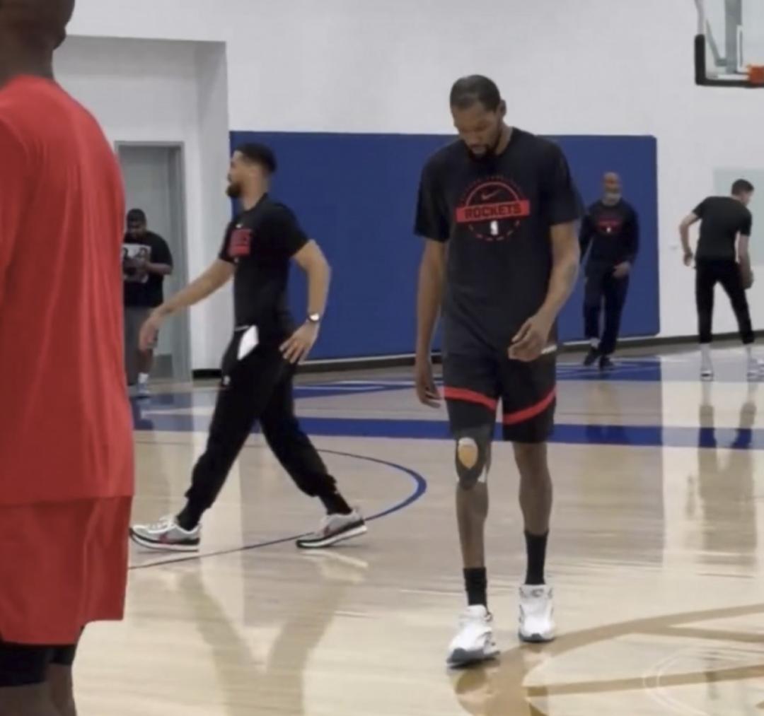 During today's training, Durant wore a brace on his knee. A Rockets reporter said: "KD looks good, no obvious limping or discomfort, and he's smiling a lot."