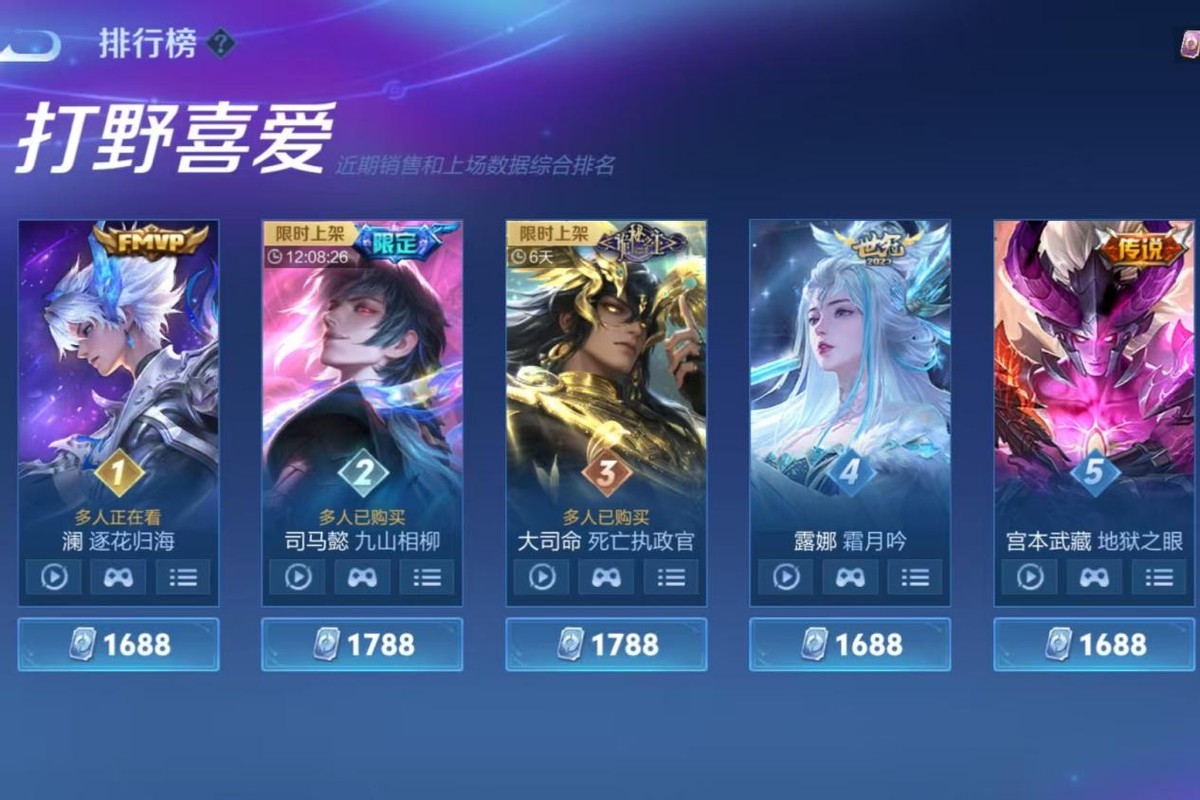 The top five favorite jungle skins are: Lan’s Flower Chasing the Sea, Sima Yi’s Nine Mountain Xiangliu, Da Siming’s Death Governor, Luna’s Frost Moon Chant, and Miyamoto Musashi’s Hell’s Eye. The first place naturally belongs to Lan’s FMVP skin Flower Chasing the Sea, which is no surprise since this skin consistently ranks high in sales. Whenever there are no new skins or reruns in the game for a while, Lan’s Flower Chasing the Sea always holds the top spot, showing how much players love it. The skin feels great to use, with the second skill’s swipe being especially smooth and almost lag-free.