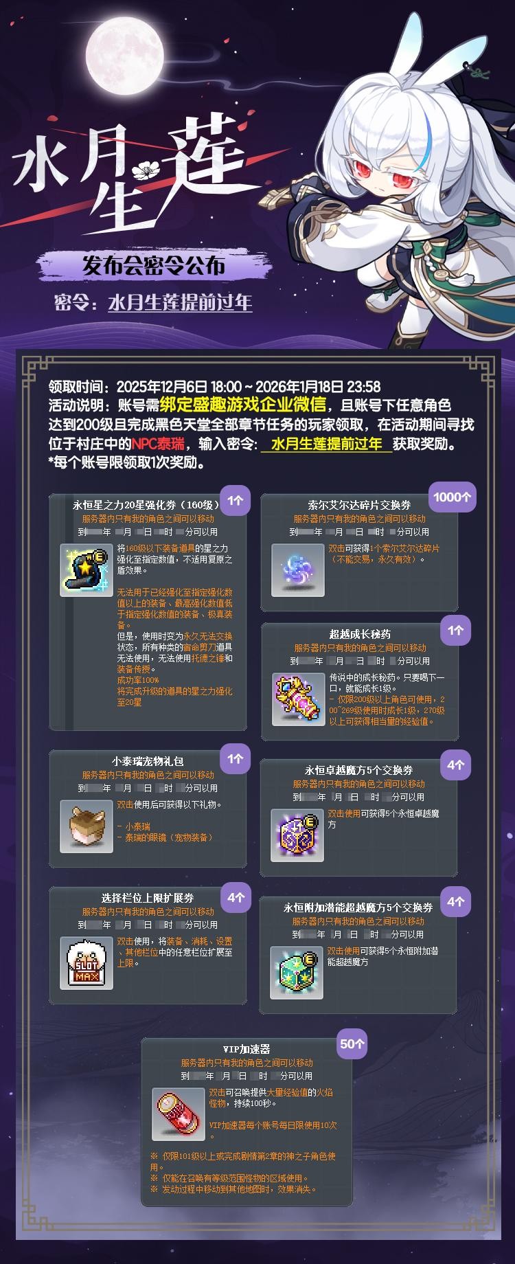 To help players quickly master the new class Lian, the developers have greatly lowered the growth threshold. Currently logging in players can claim powerful rewards like 18-star tickets and character cards. By entering the exclusive code “Water Moon Blooming Lian Early New Year,” they can also redeem practical items such as Superior Growth Elixirs, VIP Accelerators, and Eternal Excellence Cubes to support their progress.