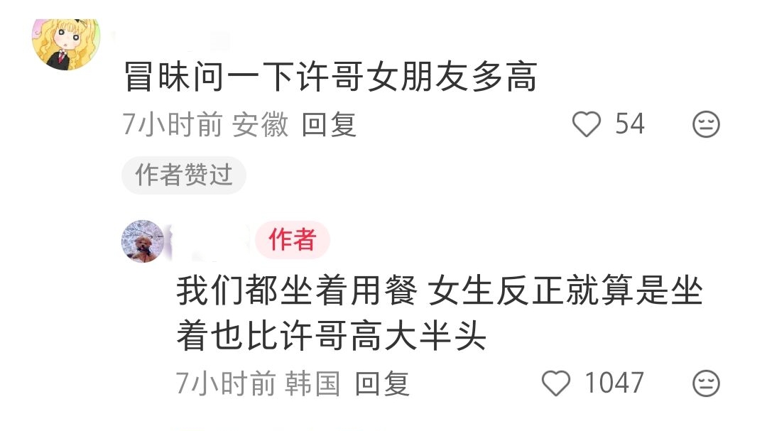 The funniest part was the fans’ comments. Someone asked: “How tall is Xu Ge’s girlfriend?” A fan replied: “Even sitting down, she’s half a head taller than Xu Ge. She must be at least 165 cm tall.” Xu Ge’s height has always been a mystery, rumored to be only 156 cm. If she’s 10 cm taller, sitting down would roughly equal half a head difference. Now that he’s in a relationship, it’s uncertain if Xu Ge can maintain his form in the new season.