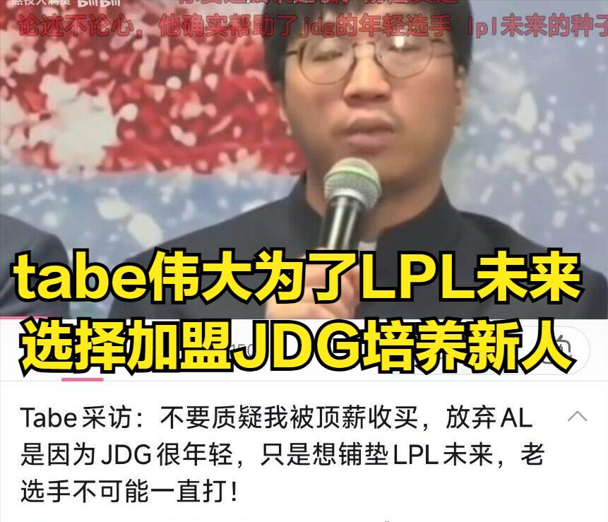 Recently, Tabe openly addressed his reasons for joining JDG in an interview, but many AL fans criticized his statements as hypocritical. Tabe said he didn’t join JDG for a top salary contract but for the future of the LPL. He pointed out that his previous team’s players were too old, and the LPL can’t rely solely on veteran players going forward. That’s why he chose to join JDG—to help cultivate more young talent for the LPL’s future.