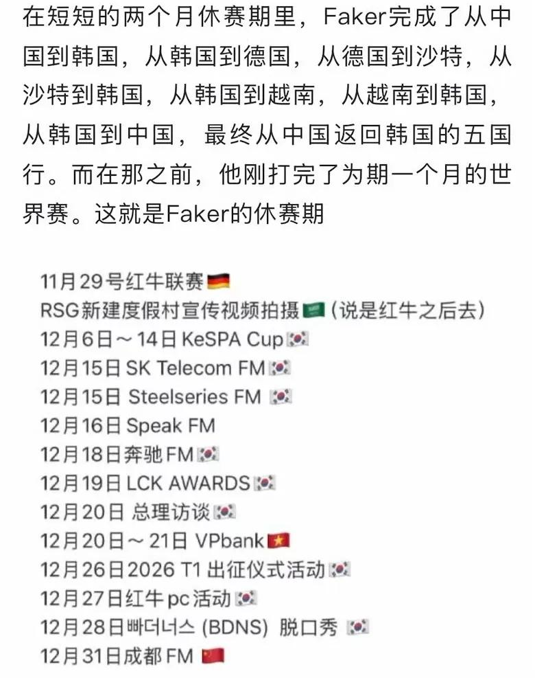 On November 9th, he won the World Championship; on the 10th, he returned to Korea; by the 15th, he had started reviewing matches. From the 16th onward, he continuously took part in numerous events, traveling globally almost every day. In just two months, Faker traveled from China to Korea, Korea to Germany, Germany to Saudi Arabia, Saudi Arabia back to Korea, Korea to Vietnam, Vietnam back to Korea, Korea to China, and finally returned to Korea. He even attended a dinner with the South Korean president a few days ago. After a brief rest, the LCK new season is set to officially begin on the 9th.