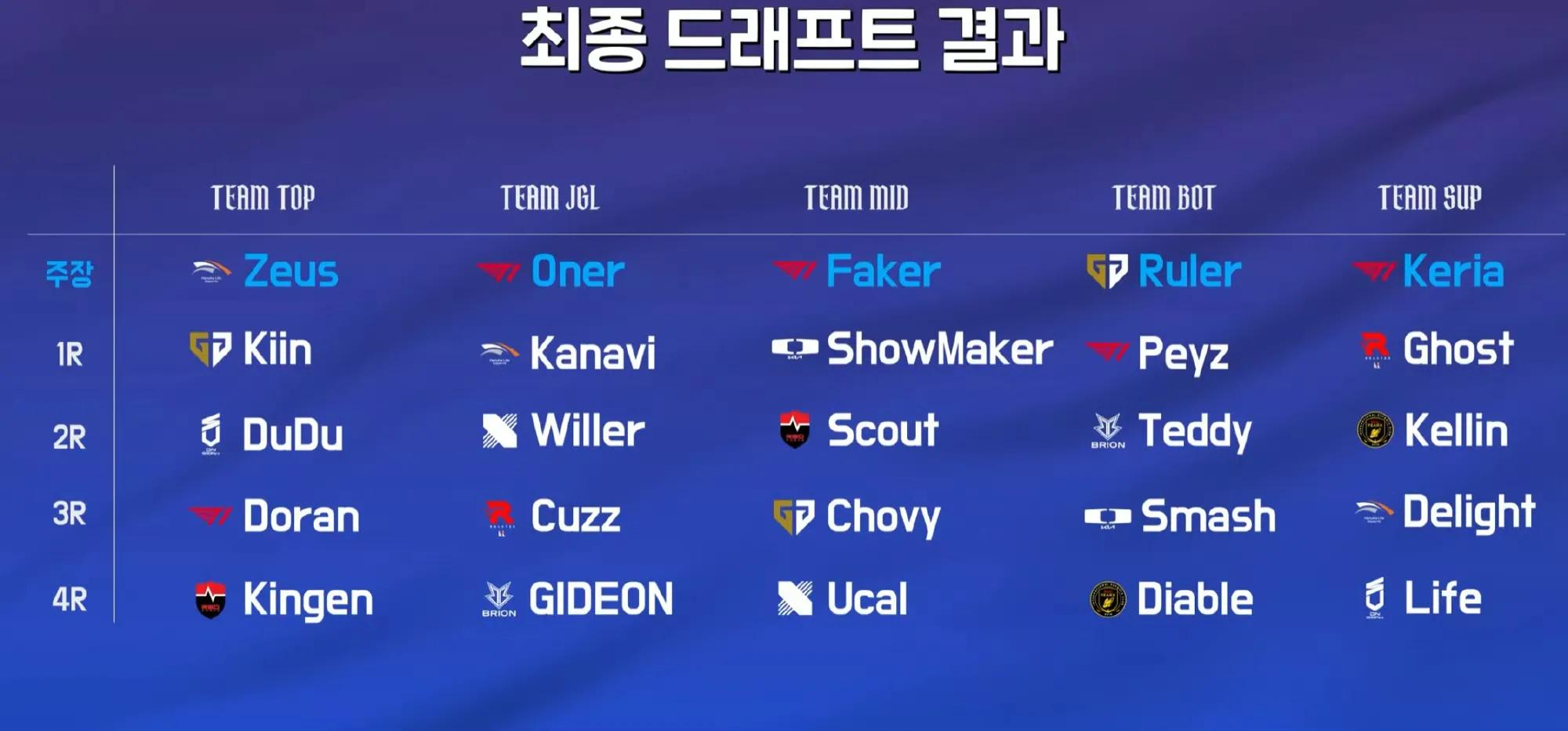 Let's first look at the players in these teams: Top lane team includes Zeus, Kiin, Dudu, Doran, and Kingen. Jungle team has Oner, Kanavi, Willer, Cuzz, and Gideon. Mid lane team consists of Faker, Showmaker, Scout, Chovy, and Ucal. AD carry team features Ruler, Peyz, Teddy, Smash, and Diable. Support team includes Keria, Ghost, Keliin, Delight, and Life. Notably, only T1's starting five players all participated; other teams didn't have full representation. Even the well-known Gen.G team only had their three core players selected. Surprisingly, AD carry player "Little Lu Bu" did not take part in this entertainment match.