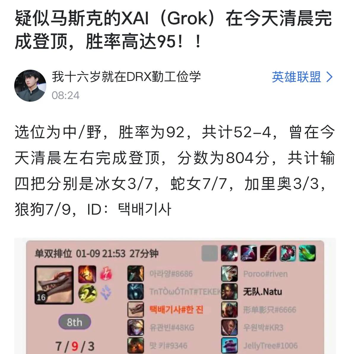 I thought Elon Musk’s AI team was just talk before, but now it’s already testing on the Korean server. After just over 50 ranked games, it has topped the Korean server with a 95% win rate. It’s truly terrifying. I wonder how the pro scene would handle facing Faker’s T1 team if this AI squad appears. Can they really fight for humanity and win the championship?
