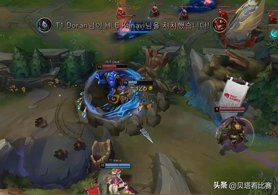 In the first game, T1 picked Aphelios top, Pantheon jungle, Ryze mid, and Lucian with Lumen in the bot lane; HLE chose Rumble top, Vi jungle, Taliyah mid, and Tristana with Alistar bot. Around 3 minutes, HLE ganked top, but Oner’s Pantheon countered, resulting in a 1-for-1 trade with Zeus’s Rumble securing first blood. T1 then repeatedly targeted Zeus’s Rumble, while HLE successfully pressured bot lane and secured two dragons. Early game gold was nearly even between both teams.
