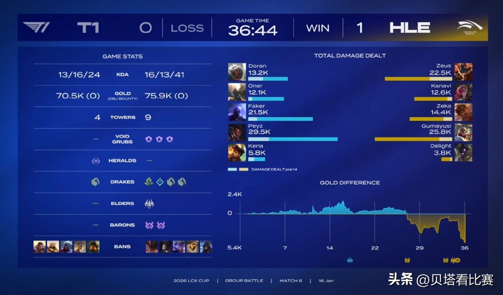 The LCK Cup BO3 match between T1 and HLE featured T1’s starting lineup of Doran top, Oner jungle, Faker mid, and Peyz alongside Keria bot; HLE responded with Zeus top, Kanavi jungle, Zeka mid, and Gumayusi paired with Delight bot. After three intense games, T1 emerged victorious with a 2-1 score, taking the first win of the season!