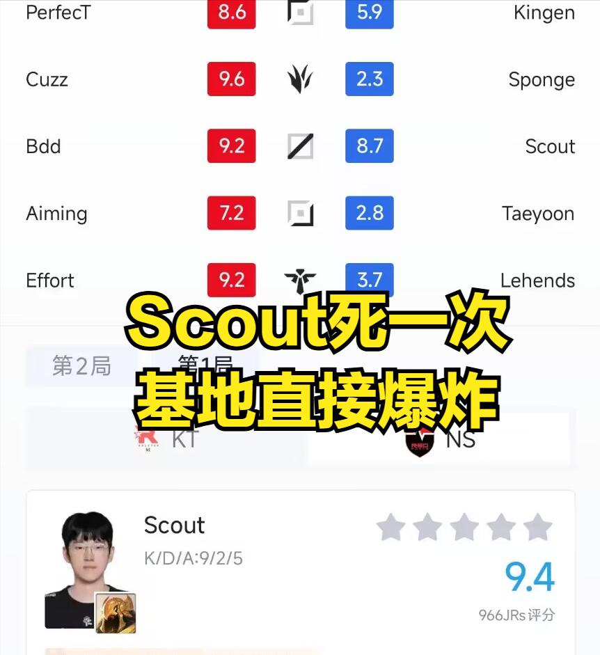 Although Scout lost the top-spot match against BDD, his individual performance in the game truly didn't fall short of BDD. In the first game, Scout played Azir with a perfect 9-2 record—one could say if Scout died once, the team's base would explode instantly. In the second game, Scout's Sylas was a "tragic hero," making early roams and sacrificing himself in team fights to eliminate enemy carries. Many viewers joked that Scout brought LPL-style play to LCK. Post-match player ratings show Scout is NS's best-performing player.