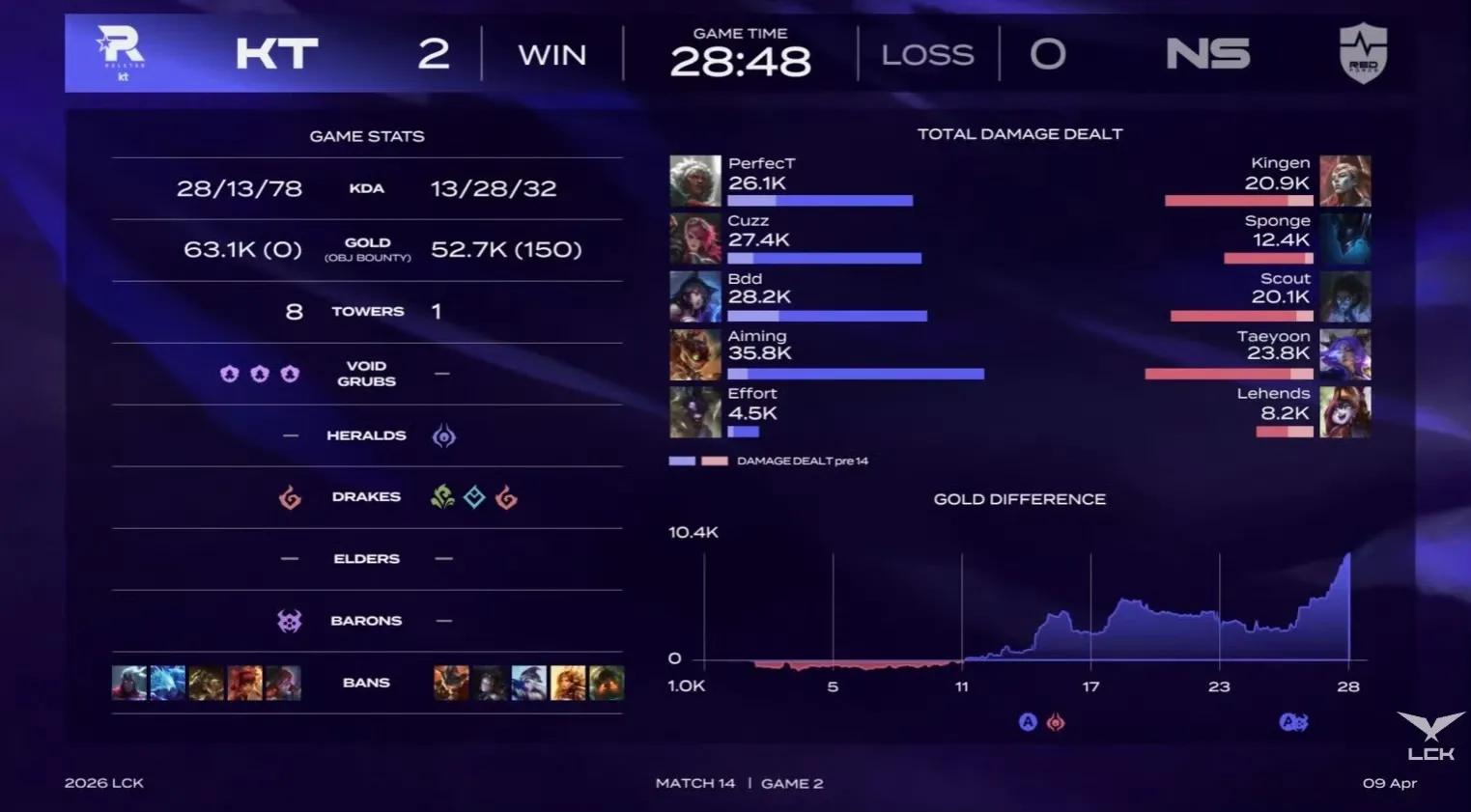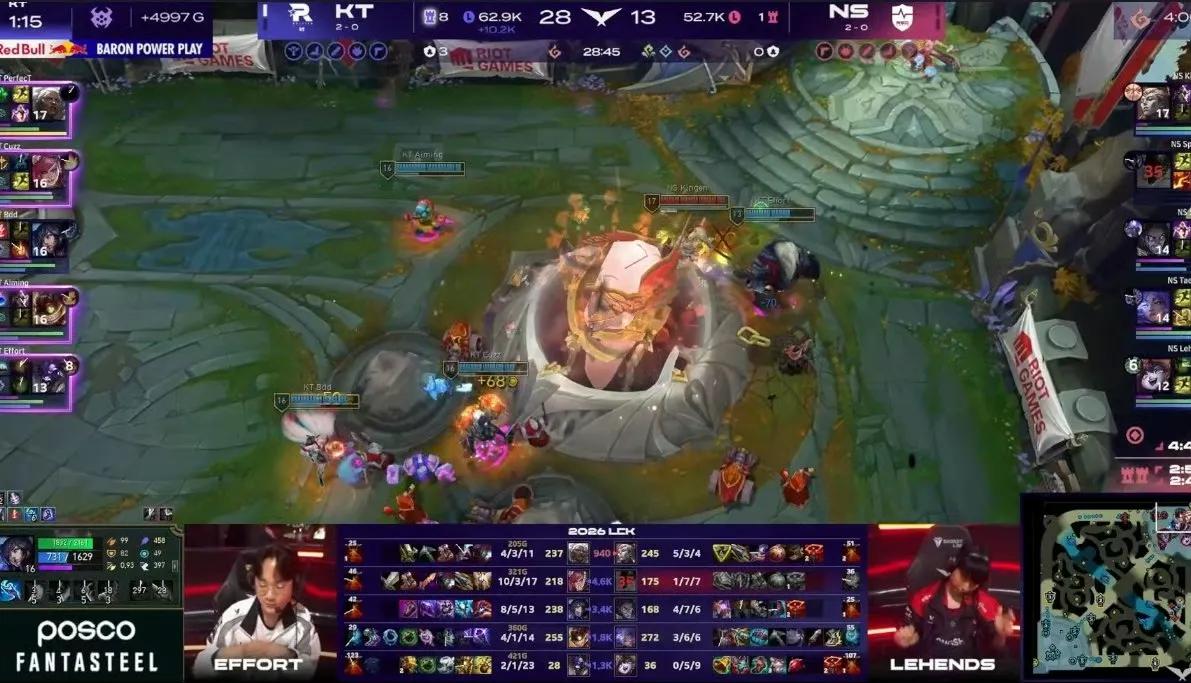 In recent matches, KT team defeated NS team 2-0, securing a three-win streak at the start and ranking first in the LCK with a 3-0 record and a net win score of 5. The first game was highly intense, lasting 38 minutes, where Aiming's Caitlyn, with her long-range advantage, secured victory in team fights,艰难地 winning the first match. The second game had no悬念, with a significant gap in jungle performance; Cuzz achieved a 10-3-17 record, driving the节奏 of the entire game—28 kills, 27 of which were related to him. Currently, KT team seems transformed.