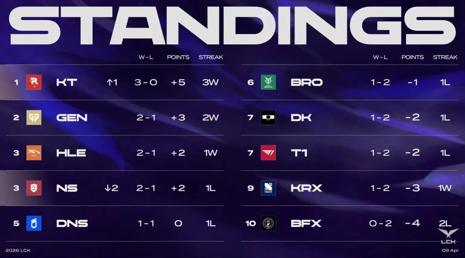 Looking at the current LCK standings: KT team leads with a 3-0 record, ranking first. Gen, HLE, and NS teams follow closely with 2-1 records. DNS team holds a 1-1 record, placing fifth. BRO, DK, T1, and KRX teams rank sixth to ninth with 1-2 records. Meanwhile, BFX team, the second seed that recently participated in the Global先锋赛, currently holds a 0-2 record, ranking last in LCK. Currently, T1 team seems particularly struggling, having only defeated HLE—though this is also related to match intensity, as their two losses were against Gen and KT teams.