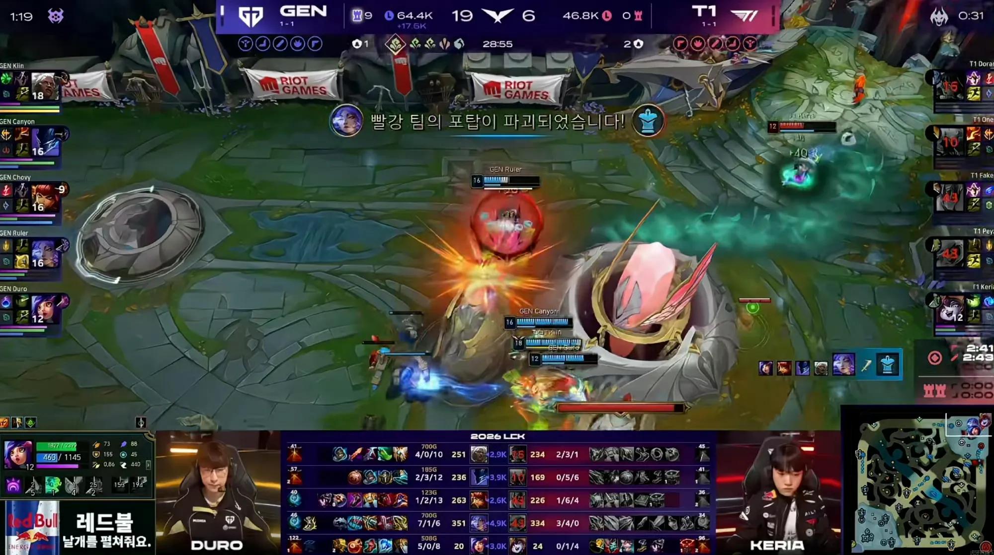 From the start of the first game, T1 faced lane issues, especially with Kiin's Sion being solo-killed by Doran's Jayce in the top lane. With the top lane shattered, T1 had no resistance, suffering consecutive 1-for-4 trades in the dragon pit. Chovy's Anivia utterly overwhelmed T1's five players, securing victory in just 25 minutes. In the second game, T1 somewhat adopted a four-protect-one strategy, with Faker using his signature Galio. It was expected to turn the tide, but the second match felt like a one-click sweep; T1 was battered throughout, with no ability to retaliate, even experiencing a "clean tower" defeat, with their base destroyed in 29 minutes.