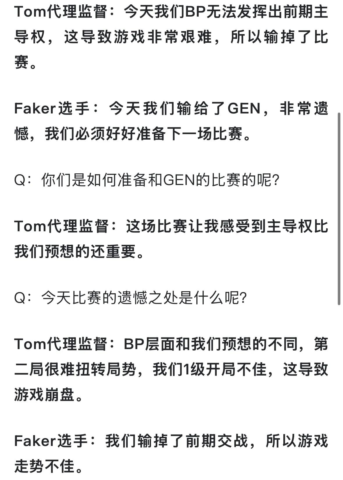 The second game felt like Gen.G was simply farming, winning effortlessly with minimal confrontation between teams. Faker's Galio was beaten into a 1-6 score, his champion skin utterly crushed. In post-match interviews, Faker responded to this match, stating that losing to Gen.G was regrettable and they need to prepare well for the next game. The key to defeat was early engagement issues, leading to poor game flow. Faker also mentioned that compared to the beginning, his competitive level is continuously improving and he will maintain higher standards in the future.