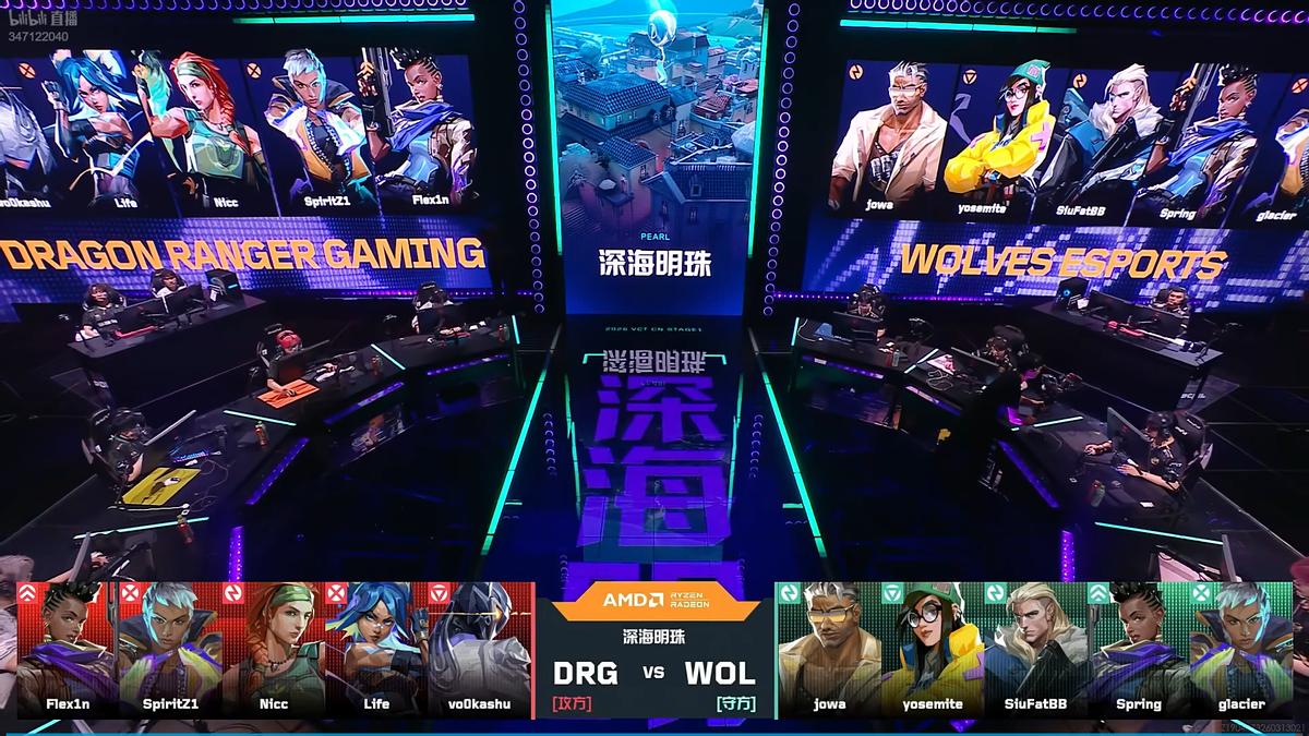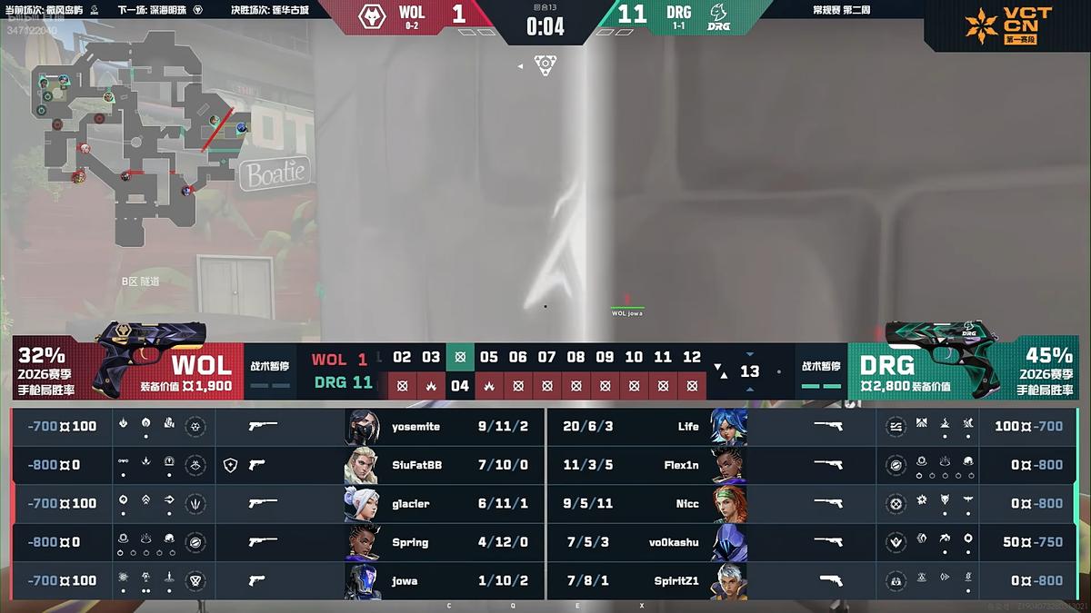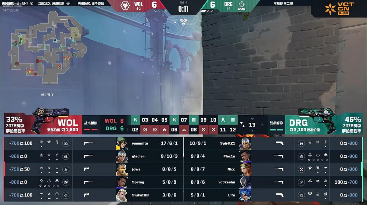 Round five, Vo0kashu achieved a quadruple kill, allowing DRG to overtake the score. Round six, DRG planted the spike in a position difficult for them to defend, leading to a successful defuse by WOL, tying the score.
