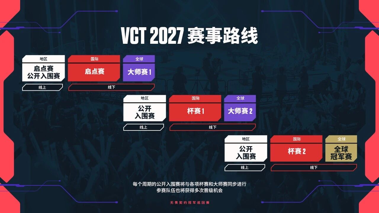 Secondary leagues are abolished, replaced by new open qualifiers; any team has the chance to participate in VCT top-tier events—if they are skilled enough, they can advance to Masters and Champions!