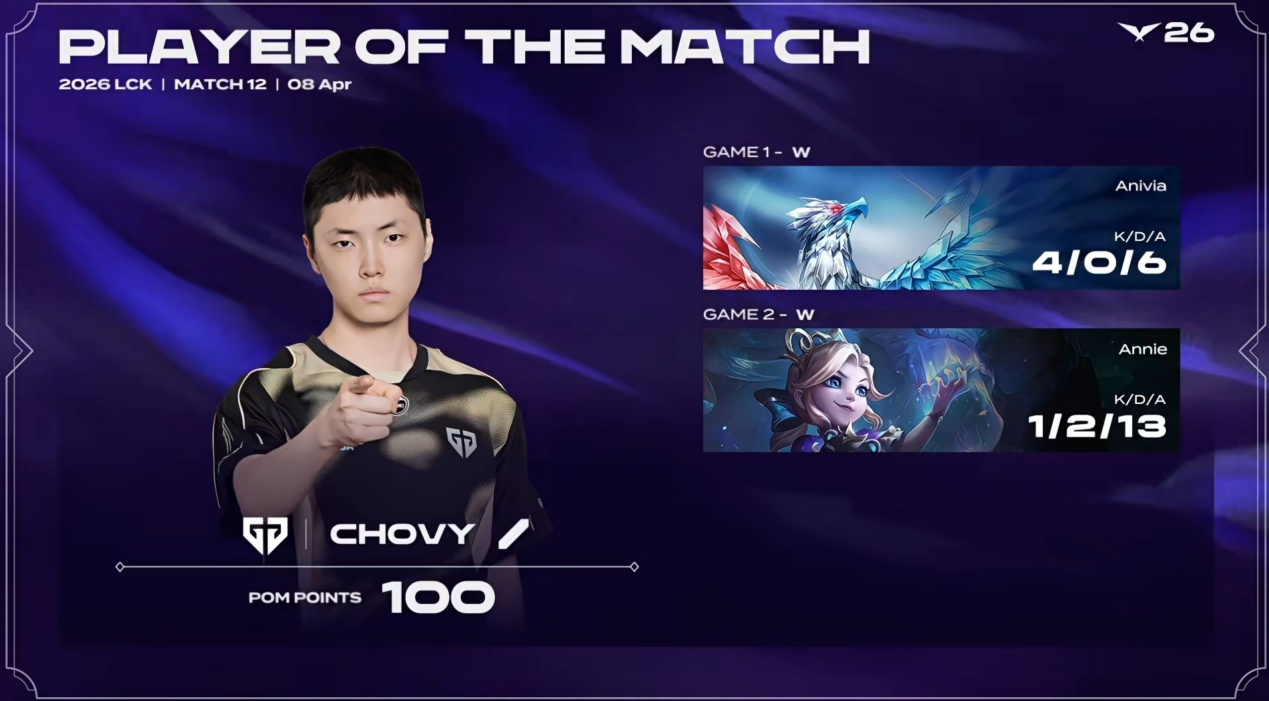 GEN then轻松推进 to the high ground. T1 attempted a desperate final push but failed again. GEN冲高地, easily won the team fight, and ended the game in one push. Faker's final score定格 at 1-6. Overall, across both games, his performance was far不及 Chovy, who also won the POG for this match.
